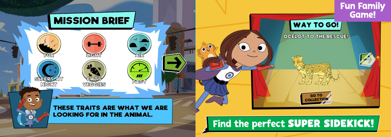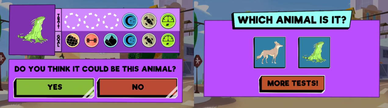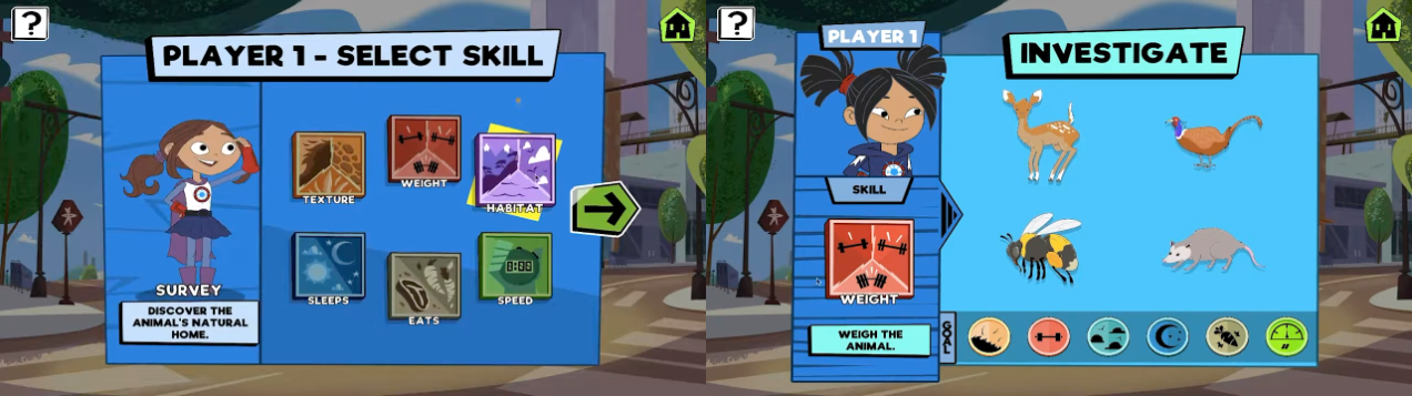 To combat these challenges we introduced a few new mechanics. First, we asked each player to select a skill at the start of gameplay. The skill they choose is connected to a character and a specific animal trait they can test. For example, Sara Snap tests the weight of the animal. This made it so each player could only test for a single trait, which isn’t enough to figure out the correct answer on their own. It incentivized more communication between players, and made it very clear who’s turn it was so passing the tablet would be easier.