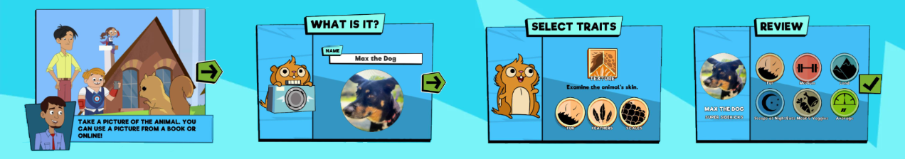 To solve this problem, we created a system that allowed players to contribute their own animal data to expand the game’s content. A new user-generated “Make” section. Players are asked to take a picture of an animal using their device camera, name the animal, and then classify it using the six classification measures used in the main game. The animal is then added to the bank and would show up as a potential match in future rounds of the game. It might even end up being the target animal!
