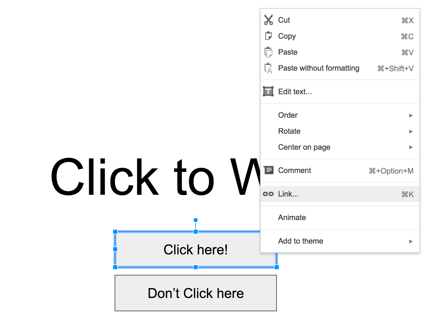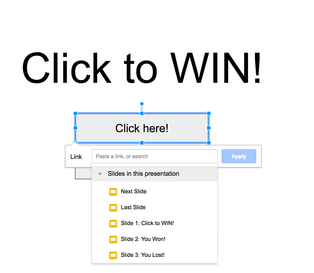 To illustrate what I mean, I’ll use google slides to create a wireframe prototype for a very simple game “Click to Win” which you can try out right now: